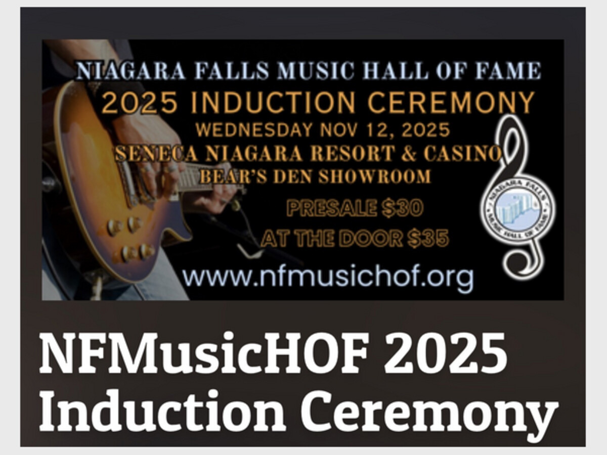 The Niagara Falls Music Hall of Fame 2025 Induction Ceremony is sure to be an unforgettable evening of live music, special tributes and shared memories, honoring the incredible contributions of this year's inductees. Doors Open at 6pm$30 Presale tickets are available starting Friday Sep 5th at noon.Tickets will be $35 day of event (Cash only at the door).Presale tickets are also available 'in person' at D'Amico Music, 2307 Pine Avenue, NF NY and Niagara Music, 2440 Military Road in the Town of Niagara.Note: Tickets are NOT available at the venue ticket outlet this year!
