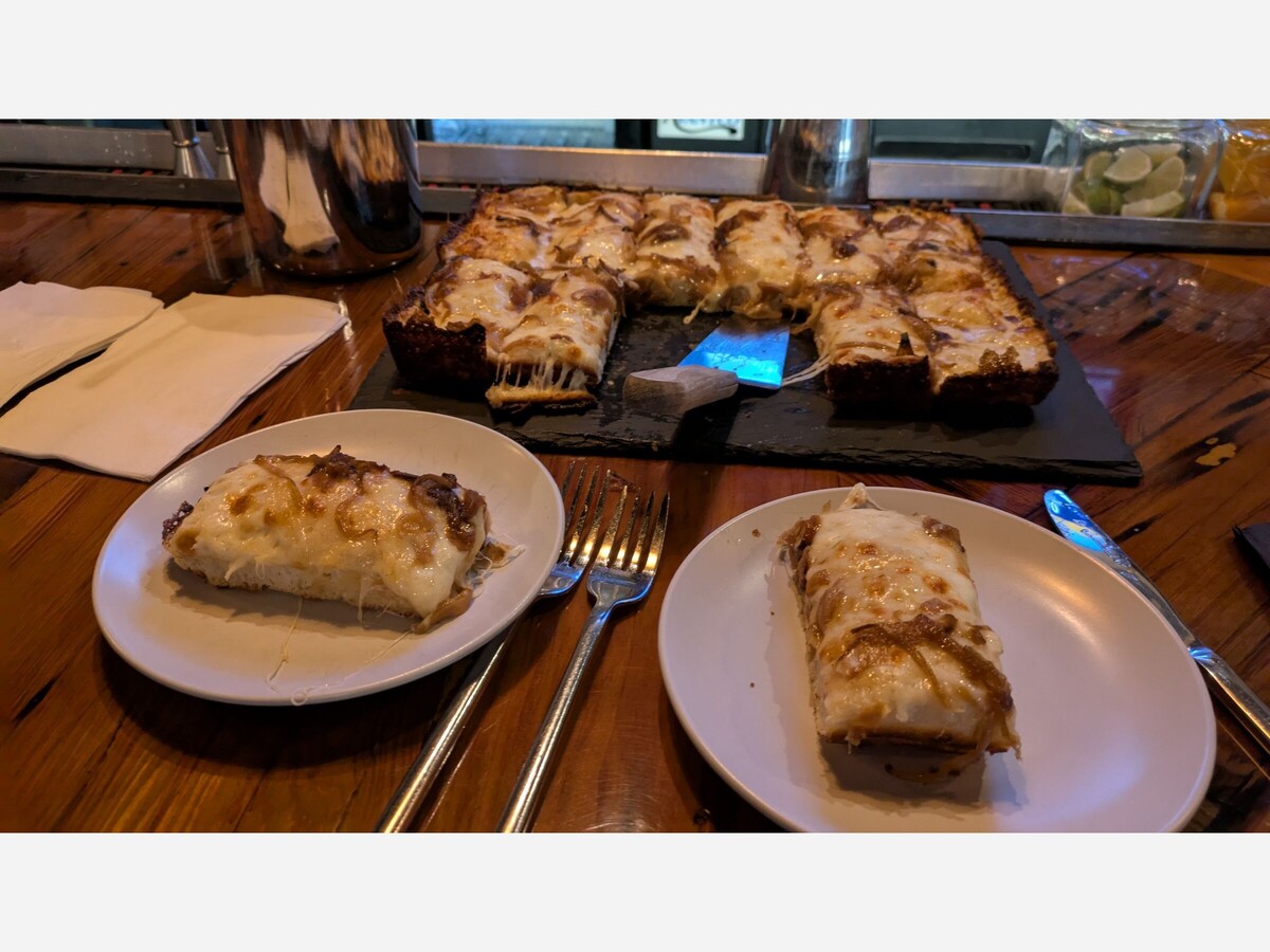 A week ago, we visited Hustler’s Tavern and shared a Detroit Pizza, French onion style. Mozzarella, gruyere, thyme and carmelized onions.