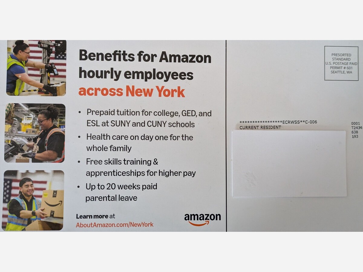 Instead, the mailing espouses the benevolent benefits provided for Amazon employees across New York.