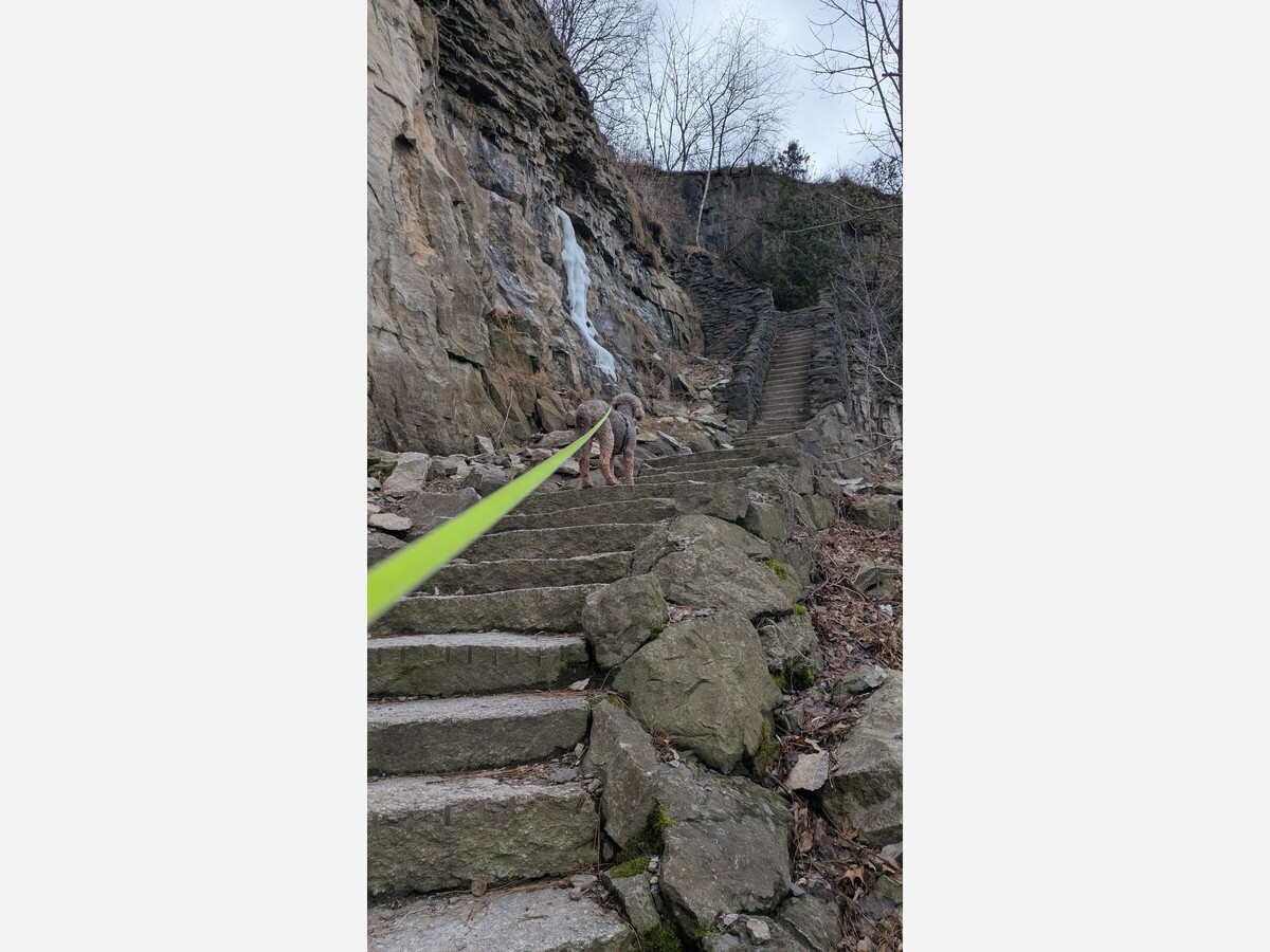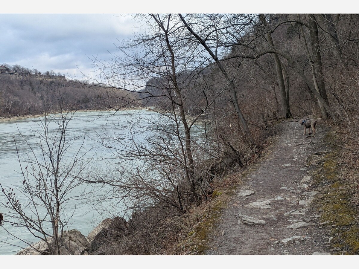 Last Sunday was the second consecutive week for heading down the Whirlpool stairs. Of course I let him off leash again this time. It was a nicer day, a bit warmer and drier than last week. Warm weather took away the snow. Today will be different.
