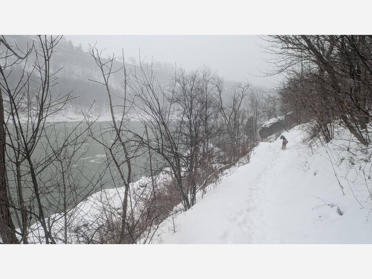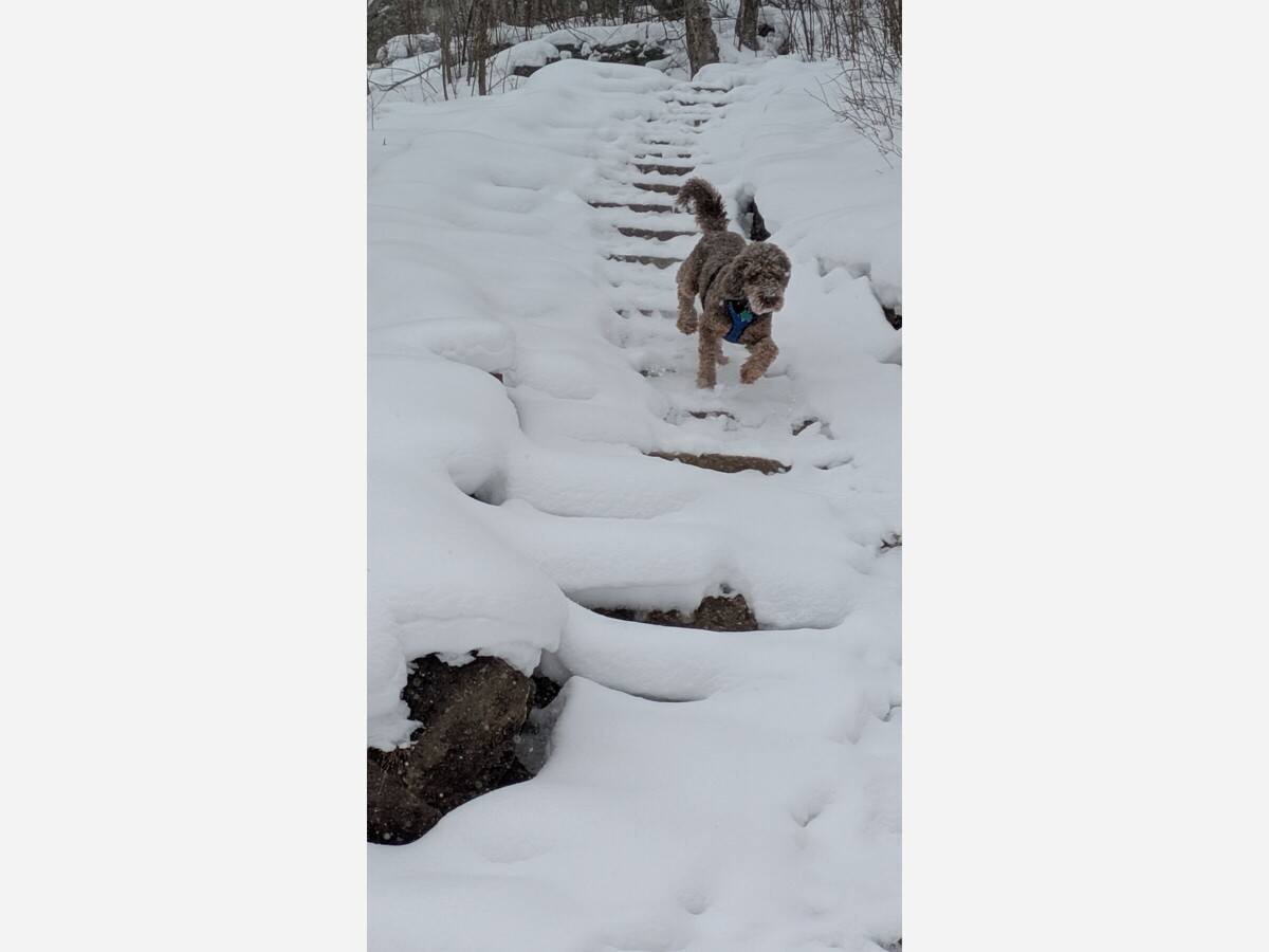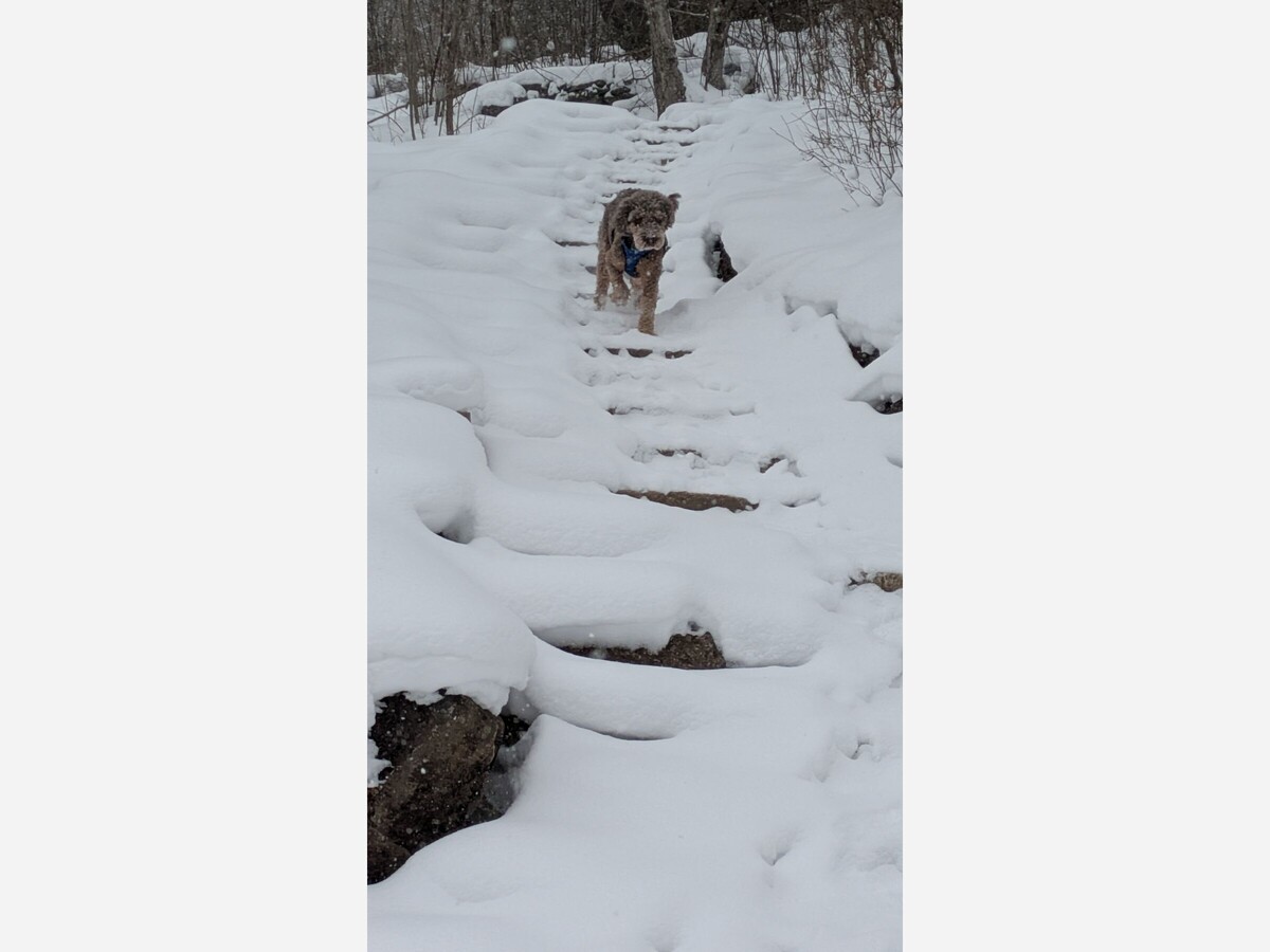 The 5-mile hike we like best took about about two hours. The snow never stopped. At one point, he stopped to gnaw ice off his paws. He even let me help clear some, which surprised me because a cold paw is a wounded paw and he was smart enough to know I would help.